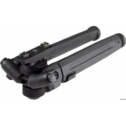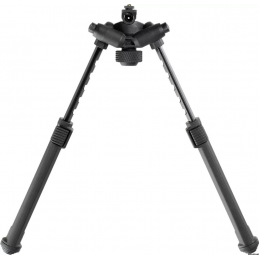 Leg extensions slide and lock securely with the push of a button on any of the seven half-inch spaced locking detents. The legs extend 3.5 inches, from 6.8” to 10.3”. An industry-exclusive 50° of total tilt and 40° of total pan are controlled by a glove-friendly knurled tool-less bipod locking knob located between the extended legs. It also has the exclusive ability to lock pan at 0° while maintaining full tilt functionality. Folded, the streamlined housing and legs fit neatly under the barrel and are just under 2.3” deep and 3.3” wide. Anodized surfaces and tight, precision tolerances mitigate squeaks and rattles.